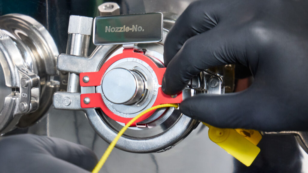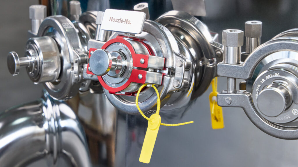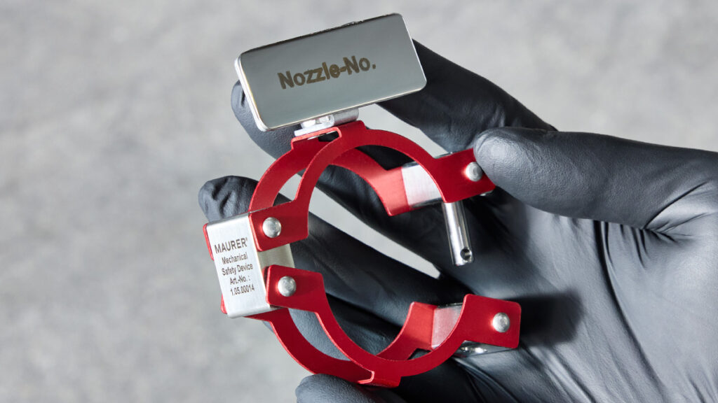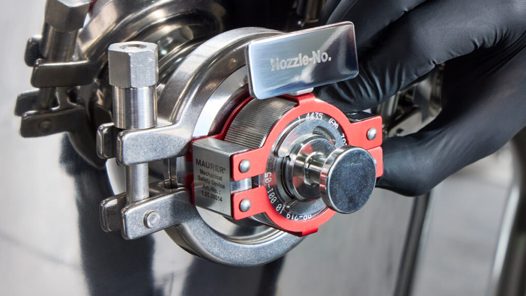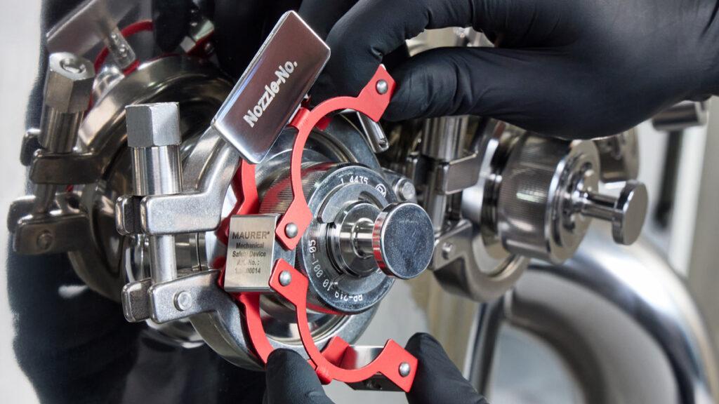 Die «MAURER® Mechanische Sicherheitseinheit» wird nach dem Einsetzen des Blindstopfens oder einer Wechselarmatur am Sicherheits-Ingoldstutzen montiert und verhindert unbeabsichtigtes Lösen oder Verdrehen des Überwurfs. Sogar bei nicht korrekt angezogenen Überwurfmuttern, beispielsweise durch Fehler bei der Montage oder durch Vibrationen im Produktionsprozess, entfaltet die Sicherheitseinheit ihre Schutzwirkung, da die Adapter sich nicht weiter lösen können.